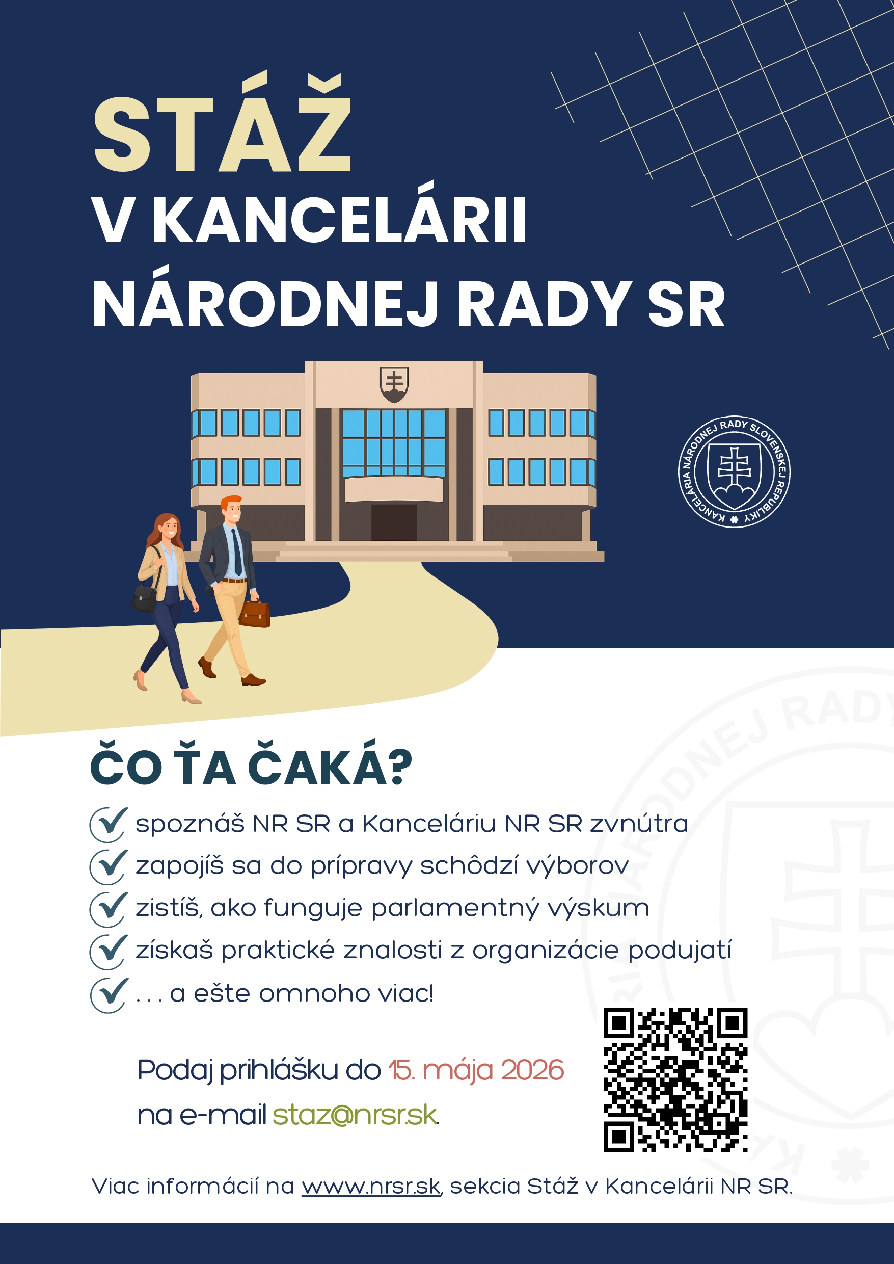 Zaujíma ťa fungovanie štátu, legislatíva alebo verejná správa? Národná rada Slovenskej republiky ponúka študentom vysokých škôl jedinečnú možnosť absolvovať stáž priamo v parlamente a prepojiť teóriu s praxou. Prihlášky sú otvorené do 15. mája 2026.